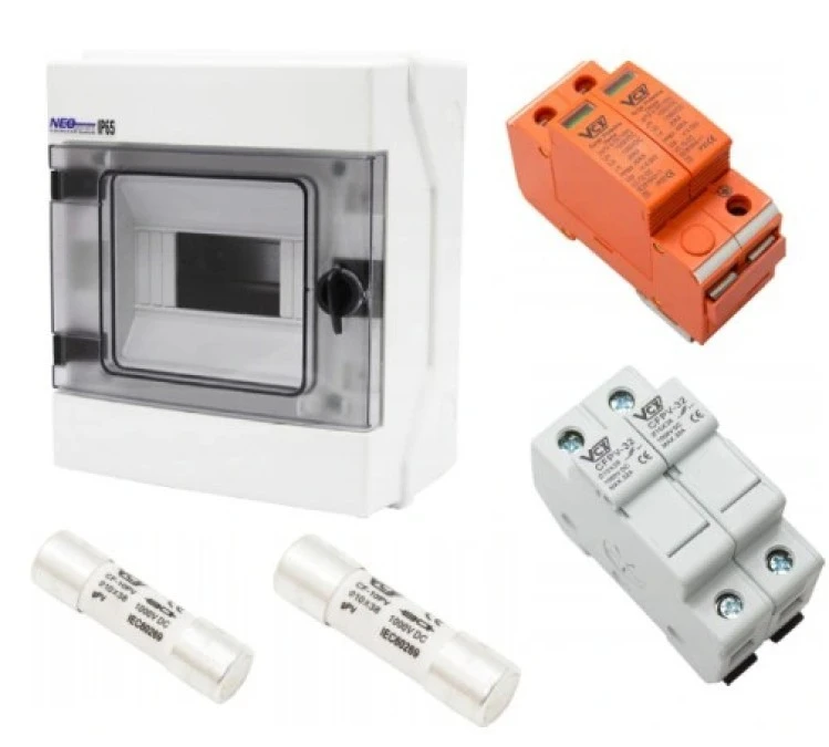 Rozdzielnica hermetyczna PV zestaw fotowoltaiczny 1 string 2P DC 1000V VCX ogranicznik przepięc + wkładki 10x38 15A 1000V DC PV