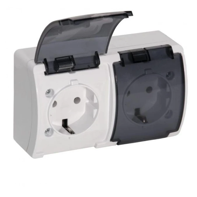 Gniazdo zasilające podwójne natynkowe hermetyczne IP44 białe z klapką dymną 2x 2P+Z Koala SCHUKO ViPlast