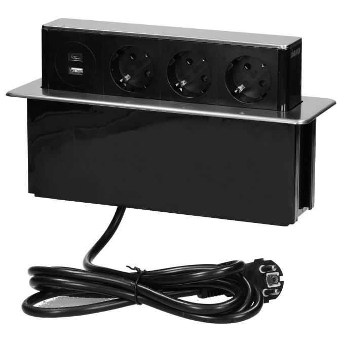 15. Gniazdo meblowe wysuwane z blatu z płaskim frezowanym rantem, ładowarką USB i przewodem 2m, 3x2P+Z (Schuko),,OR-GM-9014(GS)/B-G 676.33