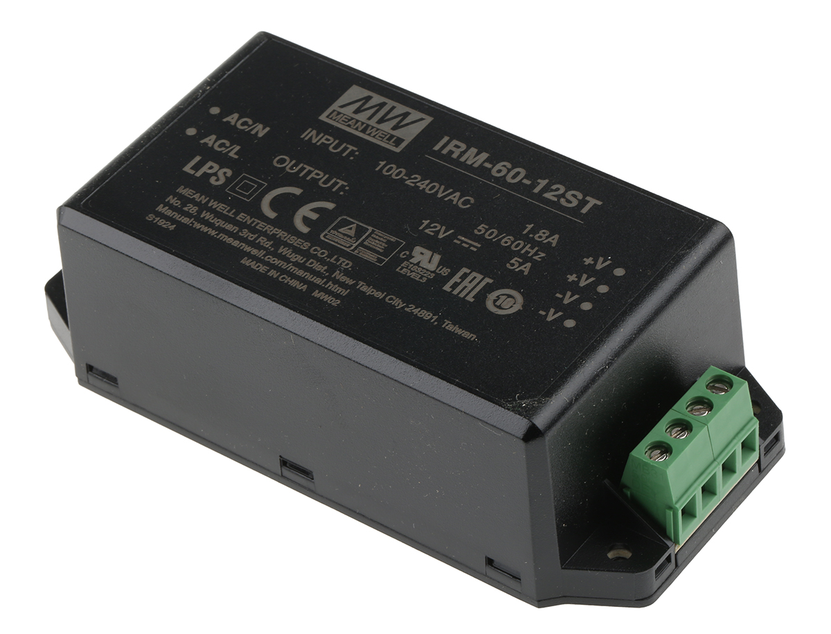 Zasilacz impulsowy nap. wyjściowe: 12V dc 60W 5A 1 wyjście nap. wejściowe: 85 → 264V ac Montaż w obudowie MEAN