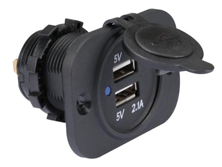 9. Velleman Built-in USB charger with 2 ports and splash-proof cover – 12–24 V to 5 V/2.1 A 77.64