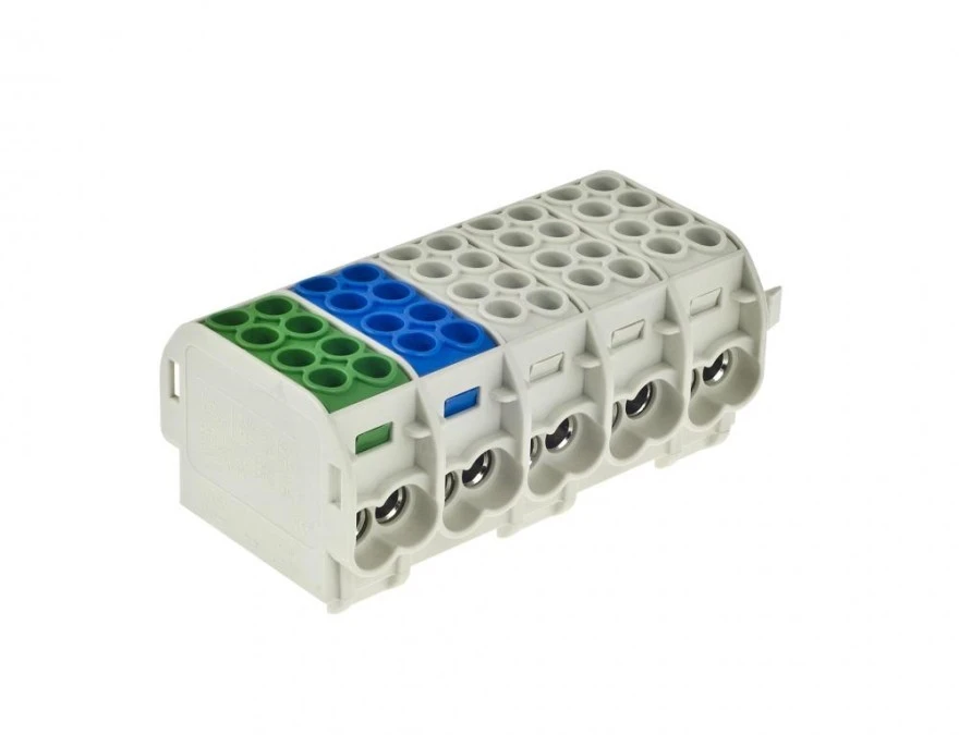 Blok rozdzielczy odgałęźny Al/Cu (max. 25mm2) na szynę TH35 kolorowy 5x (3x szary,1x niebieski, 1x zielony) SCB 25-5X SIMBLOCK S