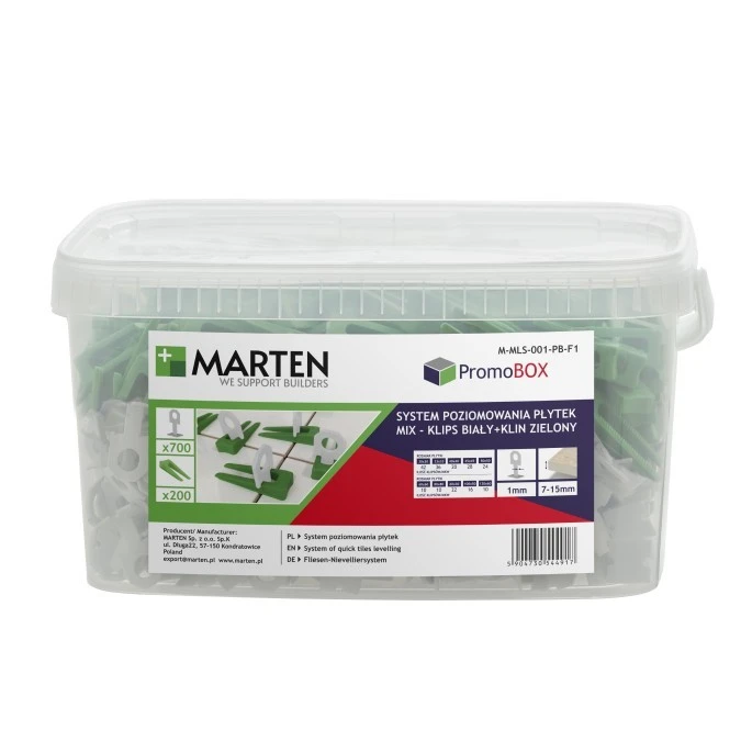 SET System poziomowania płytek KLINY zielone (200 szt)+ KLIPS BIAŁY 1 mm (700 szt) PROMO BOX