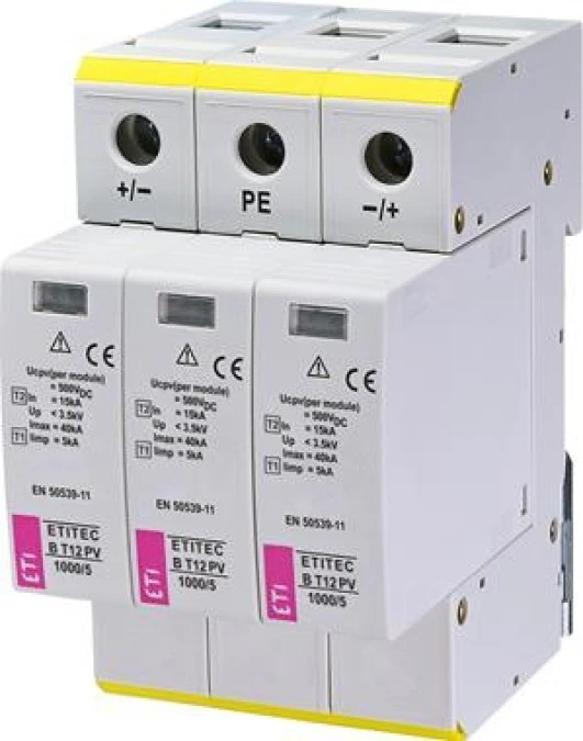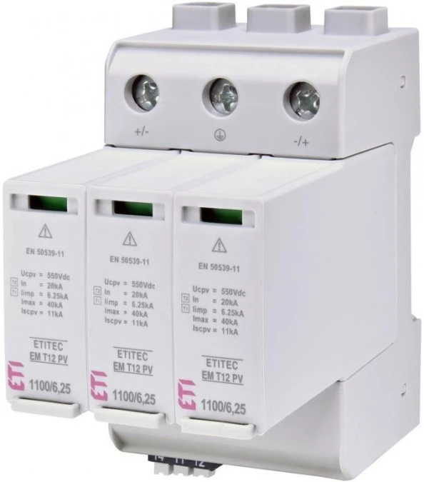Ogranicznik przepięć PV DC typ 1+2 (B+C) 1100V 3P 65kA 3,8kV ETITEC EM T12 PV 1100/6,25 Y 002440580 ETI