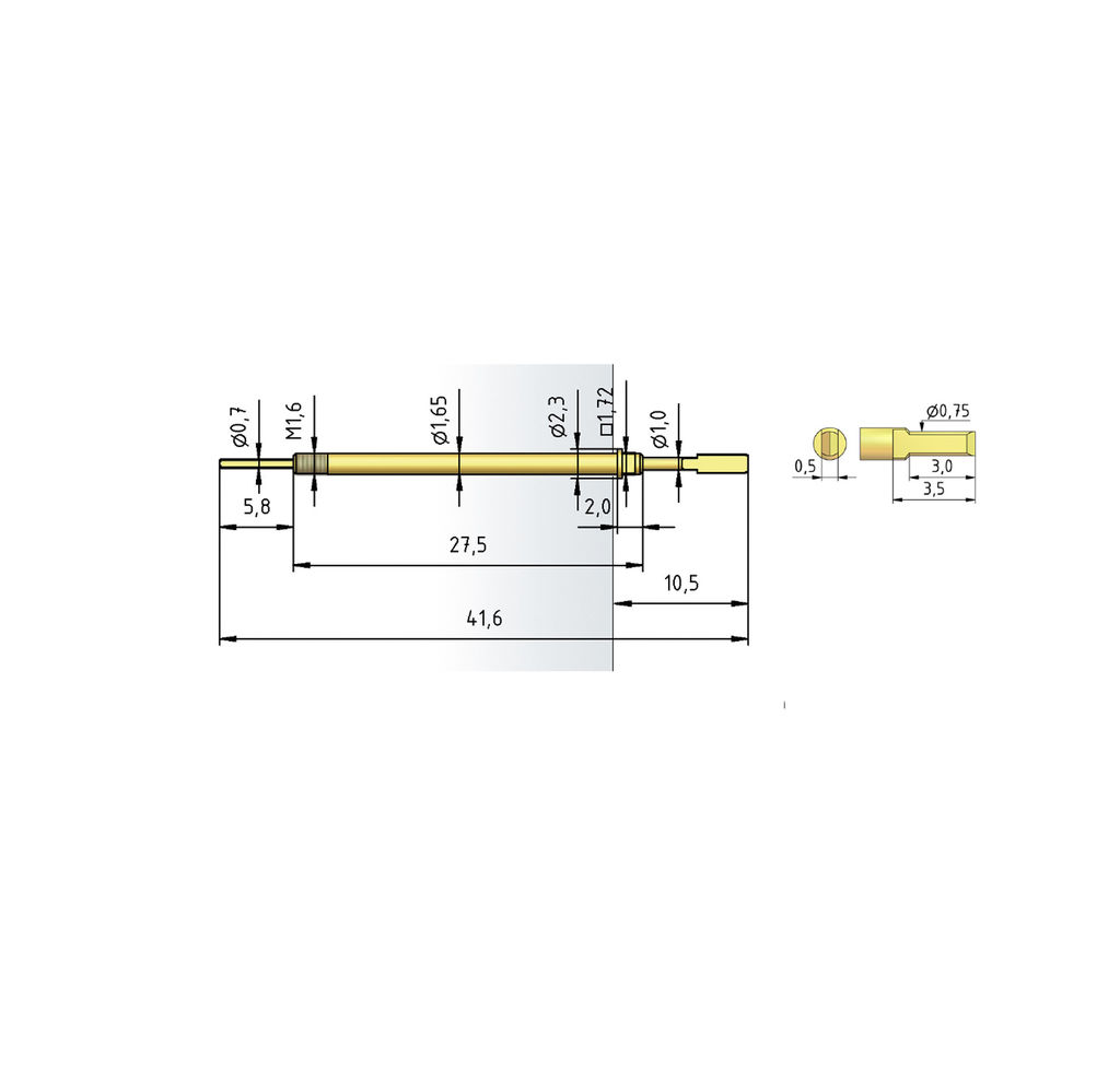 6. Thread test pin with probe, round head, Ø 2.65 mm, travel  3.5 mm, pitch 4 mm, L 22.5 mm, 5110/G-D-1.2NE-AU-2.3 C 47.87