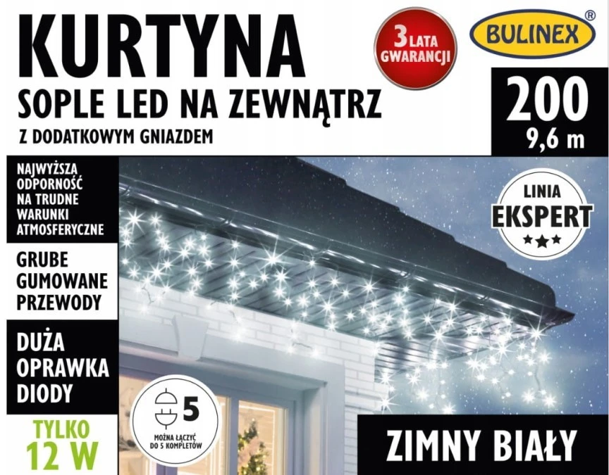 12. Lampki Bulinex kurtyna sople 200led biały zimny 9.6m biały gruby przewód 412.67