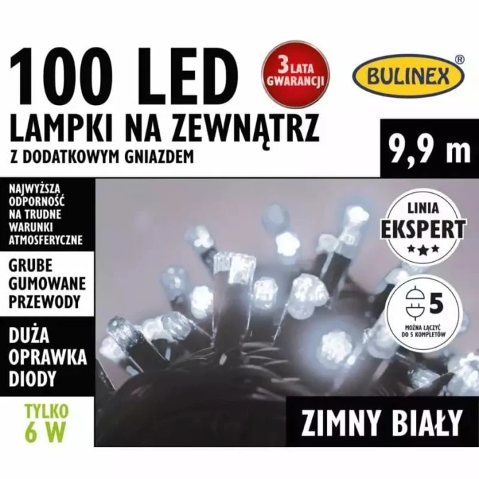 Lampki Bulinex 100led białe zimne 9,90m zewnętzrne z dodatkowym gniazdem sznur