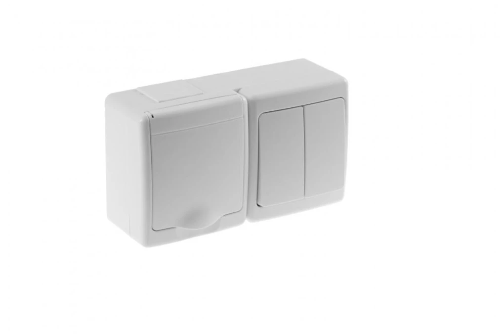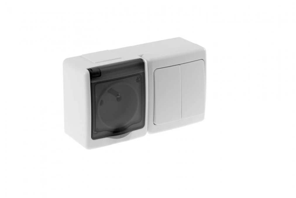 5. Łącznik schodowy pojedynczy natynkowy + gniazdo 2p+Z Schuko bryzgoszczelny IP44 biały HERMES ELEKTRO-PLAST NASIELSK 29.20