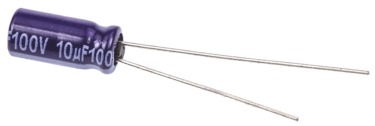 Kondensator 10μF 100V dc Radialny, Otwór przelotowy RS PRO roztaw: 2.5mm 6.3 (Dia.) x 11mm