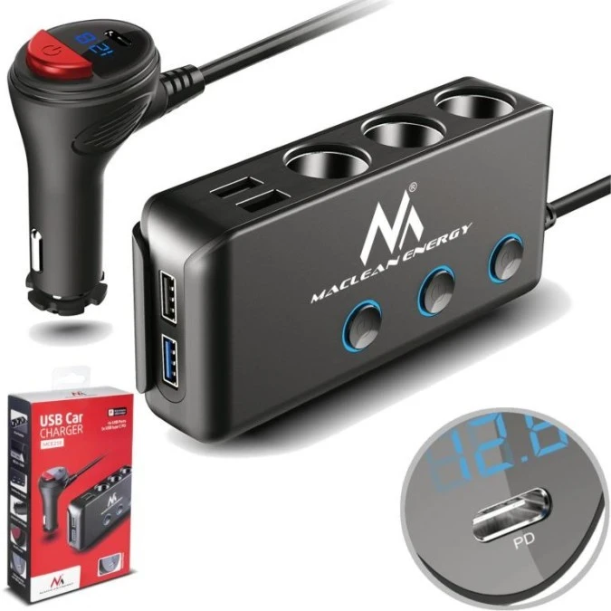 Rozdzielacz gniazda zapalniczki samochodowej Maclean MCE218, woltomierz, 3 gniazda zapalniczki, 1xQC 3.0, 3xUSB 6,8A, 1xPD 18W M