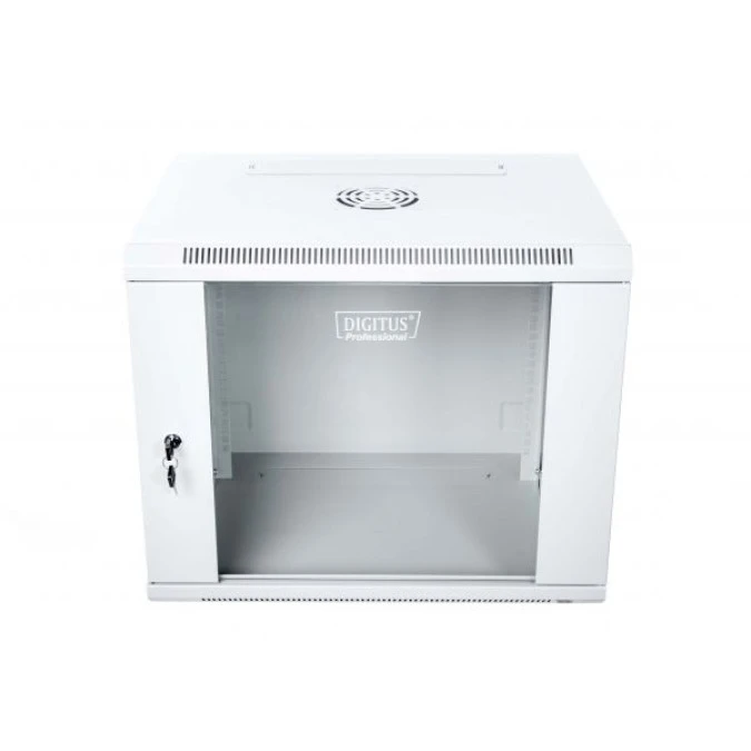 Szafa wisząca niedzielona 10 9U, drzwi blacha/szkło, 325×330x445 (szer./gł./wys. mm) RAL: szafa 7044, w komplecie półka i komp
