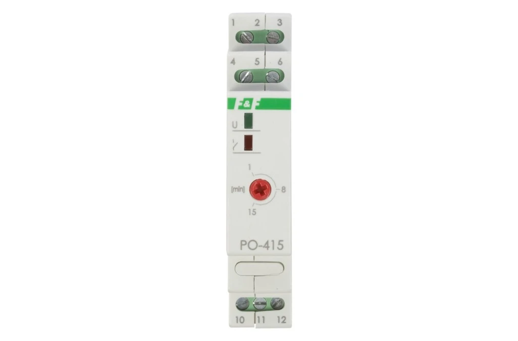 11. Przekaźnik czasowy 1P 10A 1-15min 24V AC/DC opóźnione odpadanie PO-415-24V 96.22