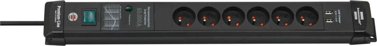 Premium-Line 60.000A listwa przepieciowa z funkcja ladowania USB 6-gniazda czarna 3m H05VV-F 3G1.5 *BE