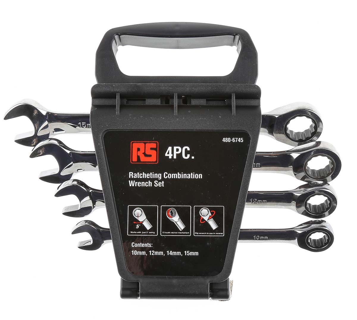 16. Zestaw narzędzi nastawnych Zestaw kluczy zapadkowych RS PRO 10 → 15 mm 4 szt. Stal chromowo-wanadowa 305.58