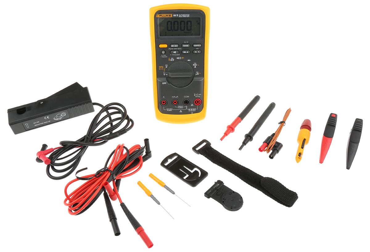 Zestaw multimetrów Fluke Multimetr, CD, wieszak miernika, podbieracz indukcyjny, przewody pomiarowe, sondy, ,
