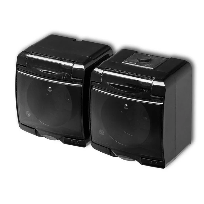 15. Gniazdo hermetyczne podwójne z uziemieniem Karlik Junior 12GHE-2D (klapka dymna) 2x(2P+Z) bez przesłon czarne 30.43
