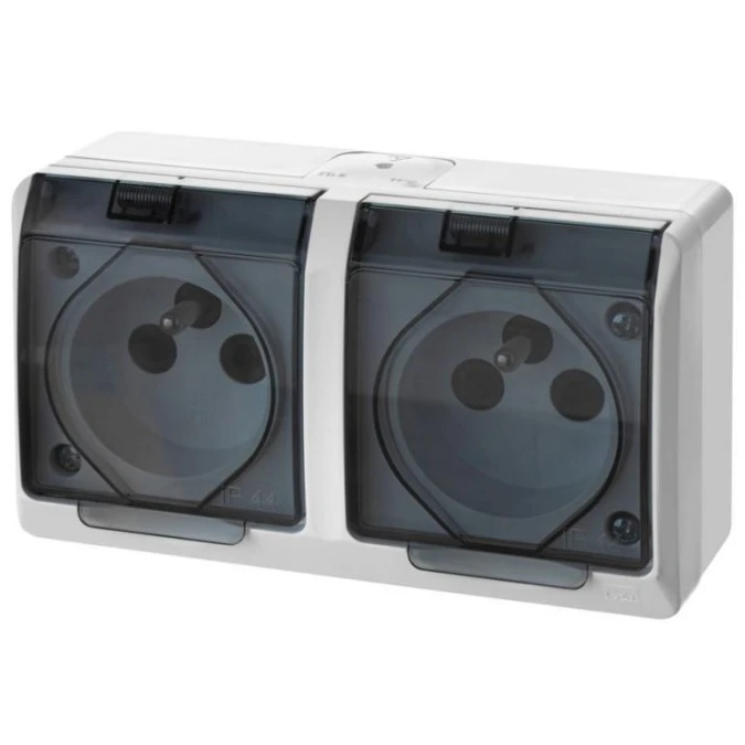 6. Gniazdo zasilające podwójne natynkowe hermetyczne IP44 białe z klapką transparentną 2x 2P+Z 16A HERMES ELEKTRO-PLAST NASIELSK 29.98
