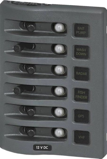 15. Panel Wodoodporny Blue Sea 12V DC z wyłącznikami automatycznymi, 6 pozycji 744.30