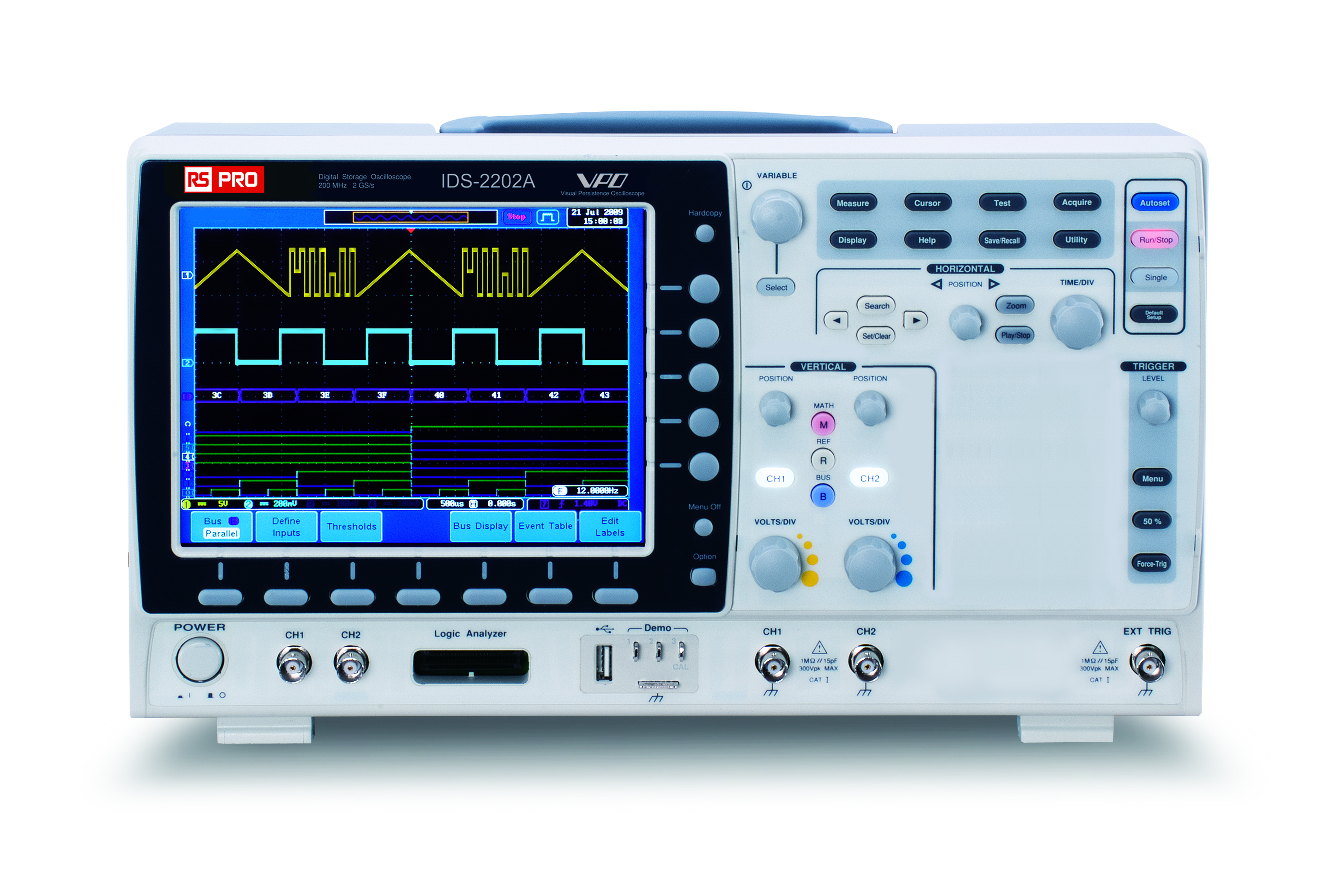 14. Oscyloskop 200MHz RS PRO Cyfrowa pamięć masowa CAT I 300V IDS2202A z kalibracją ISO CAN, IIC, LIN, RS232, SPI, UART, USB 12223.08