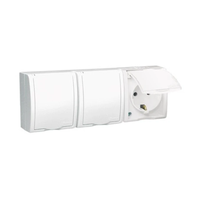 10. Simon Aquarius Gniazdo potrójne z/u SCHUKO bryzgoszczelne IP54 klapka transparentna białe AQGSZ1-3/11A 54.75