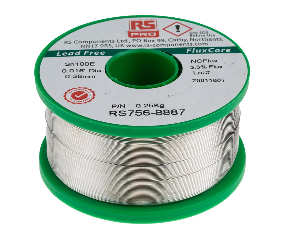 Lut bez ołowiu średnica 0.38mm RS PRO 0% Pb temp. topnienia 228°C 250g 0.5% Cu 99.5% Zn