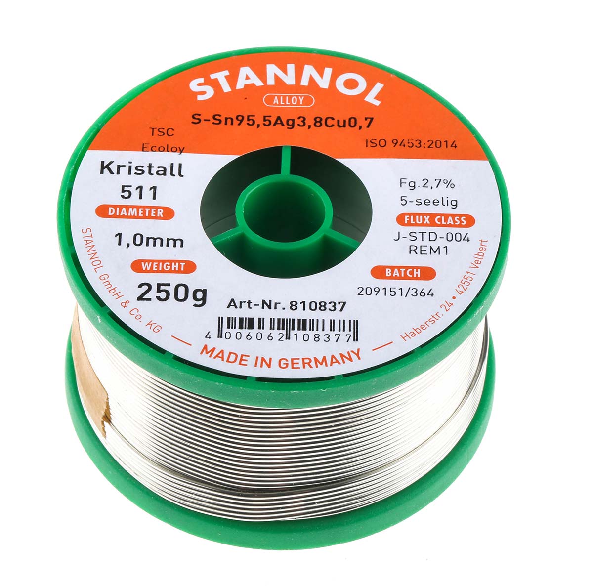 Lut bez ołowiu średnica 1mm Stannol 0% Pb temp. topnienia 217°C 250g 0.7% Cu 95.5% Zn 3.8% Ag
