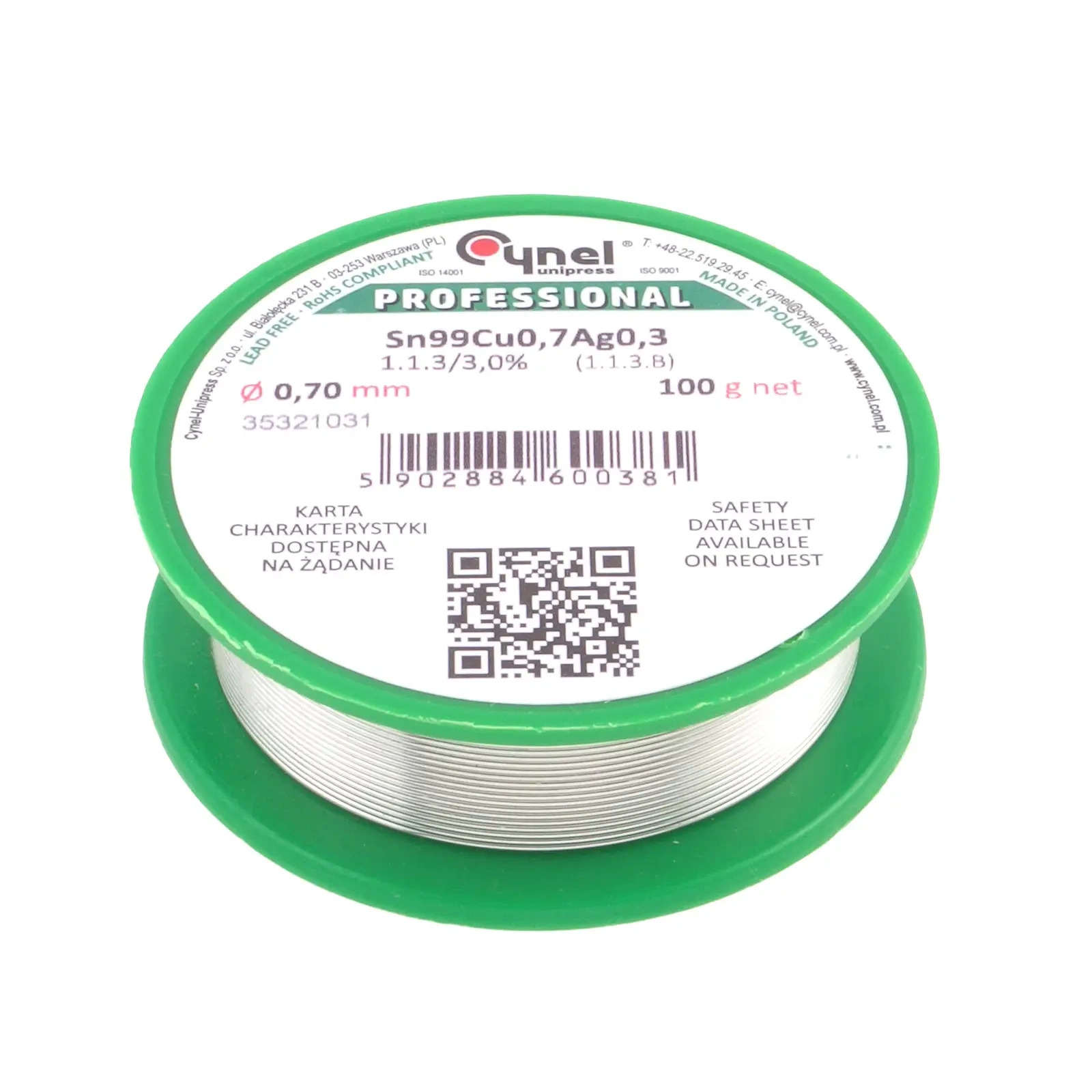 Cyna lutownicza bezołowiowa - spoiwo Sn99Cu0,7Ag0,3 - topnik 1.1.3 - 0,7mm - Cynel 100g