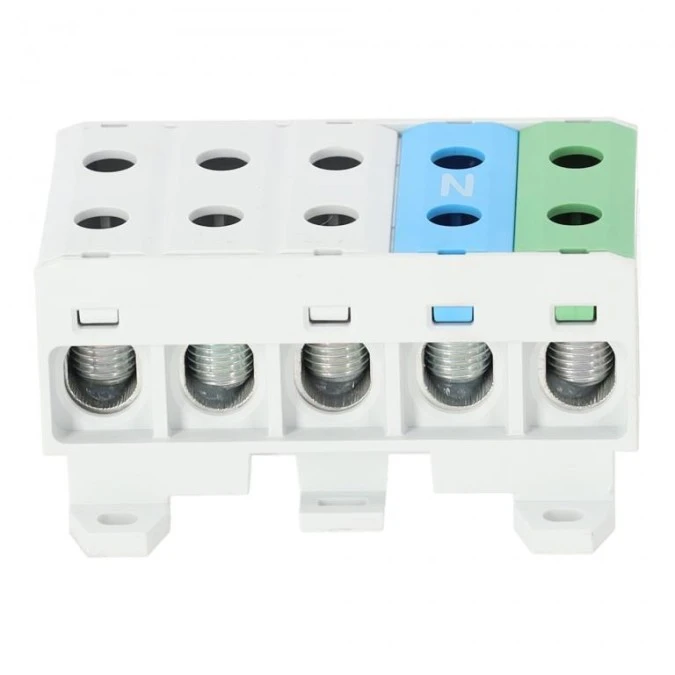 11. Złączka szynowa 5-torowa Al/Cu 2,5-50mm2 na TH35 kolorowa (3x szara, 1x niebieska, 1x zielona) FJ-E50/5 HEDO 47.06