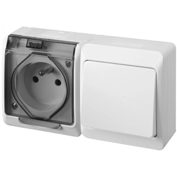Łącznik schodowy pojedynczy natynkowy + gniazdo 2p+Z Schuko bryzgoszczelny IP44 biały HERMES ELEKTRO-PLAST NASIELSK