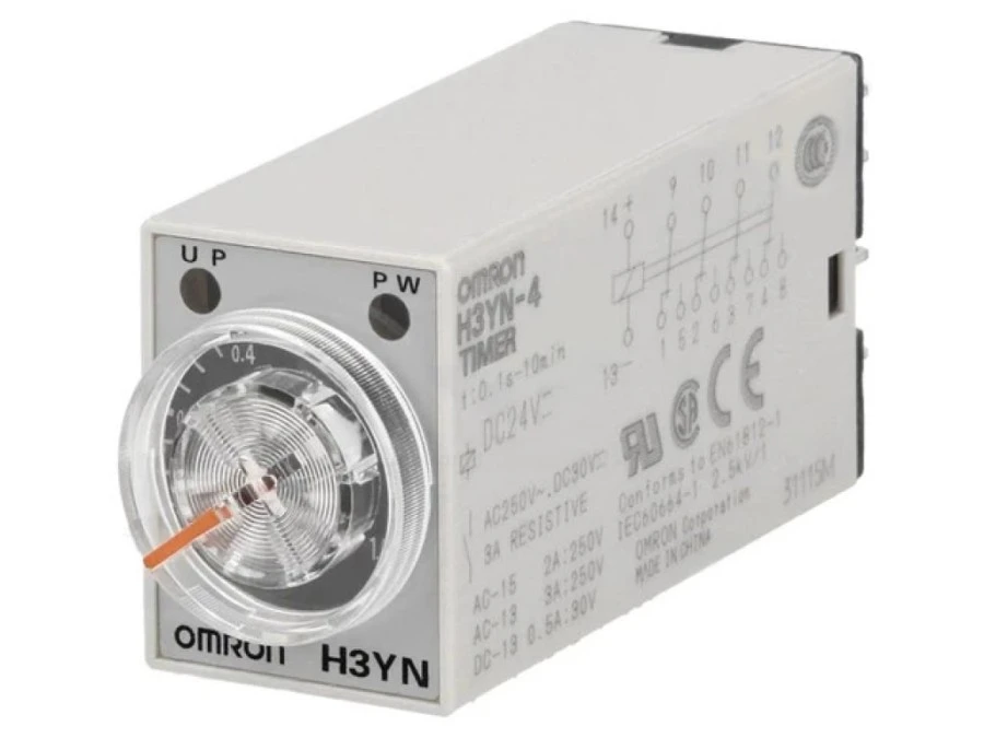 Przekaźnik czasowy o zakresie zliczania 0,1s÷10min, wyjściu typu 4PDT, napięciu zasilania 24VDC, montowany na podsta H3YN-4-24DC