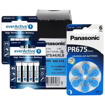 60 x baterie do aparatów słuchowych Panasonic 675 + 4szt LR6 / AA + 4szt LR03 / AAA everActive Pro Alkaline
