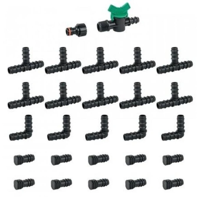 Zestaw akcesoriów do linii kroplującej 16mm (przyłącze, zawór, trójniki, kolanka, zaślepki) 27 elementów BRADAS