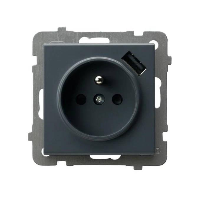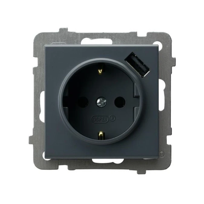 SONATA Gniazdo pojedyncze z uziemieniem z przesłonami torów prądowych, z ładowarką USB szary grafit GP-1RZPUSB/m/73