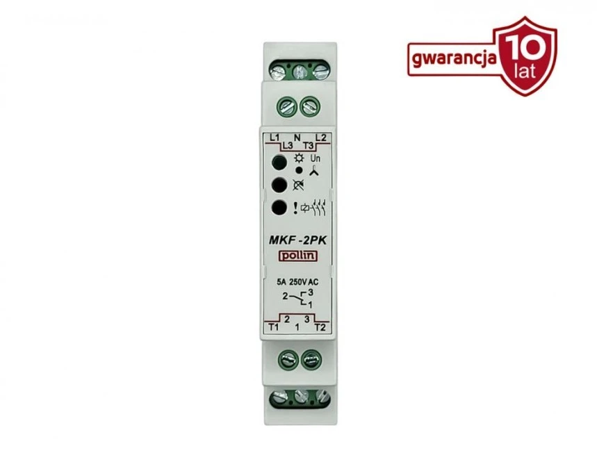 Przekaźnik zaniku, kolejności i asymetrii faz, kontrola styków, 1P, regulacja czasu i progu zadziałania MKF-2PM