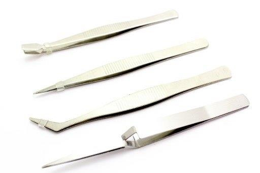 UM127.87 Komplet 4 pęset: prosta i kątowa, łopatkowa i odwrotna (samozaciskowa) - długość: 125-145mm