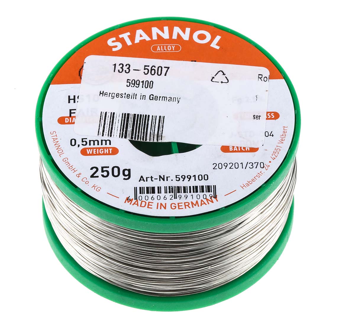 11. Lut bez ołowiu średnica 0.5mm Stannol 0% Pb temp. topnienia 227°C 250g 0.7% Cu 99.3% Zn 334.82