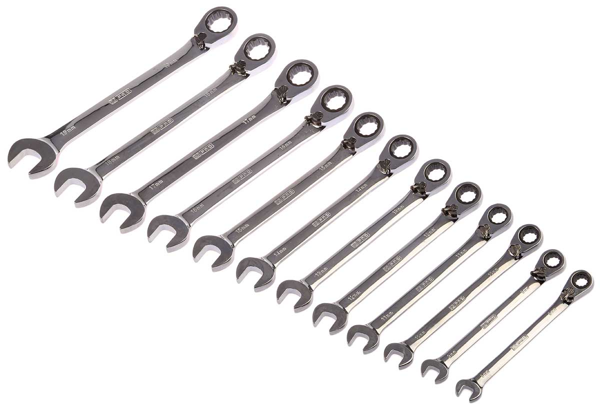 Zestaw narzędzi nastawnych Zestaw kluczy zapadkowych RS PRO 8 → 19 mm, 8 → 19 mm 12 szt. Stal chromowo-wanadowa