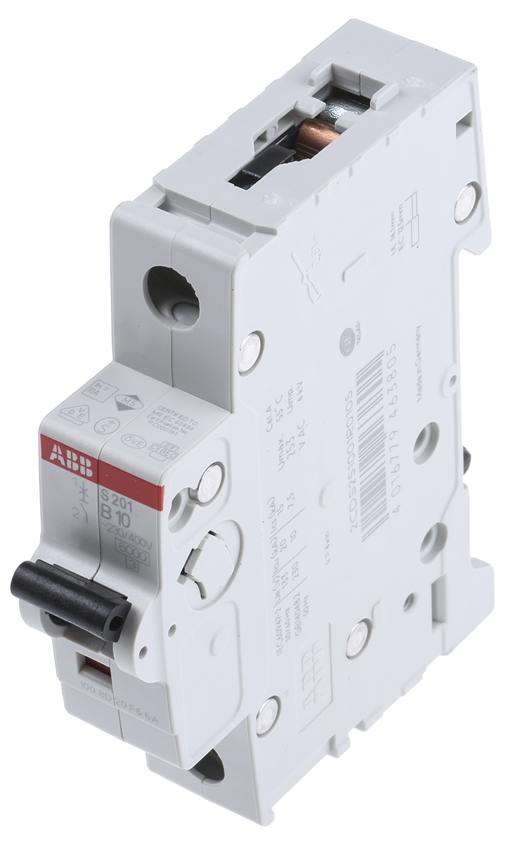 6. Wyłącznik nadprądowy MCB, Typ B, 1-biegunowy, 10A, 253V, 72V, na szynę DIN, ABB S201B10, S200 106.05