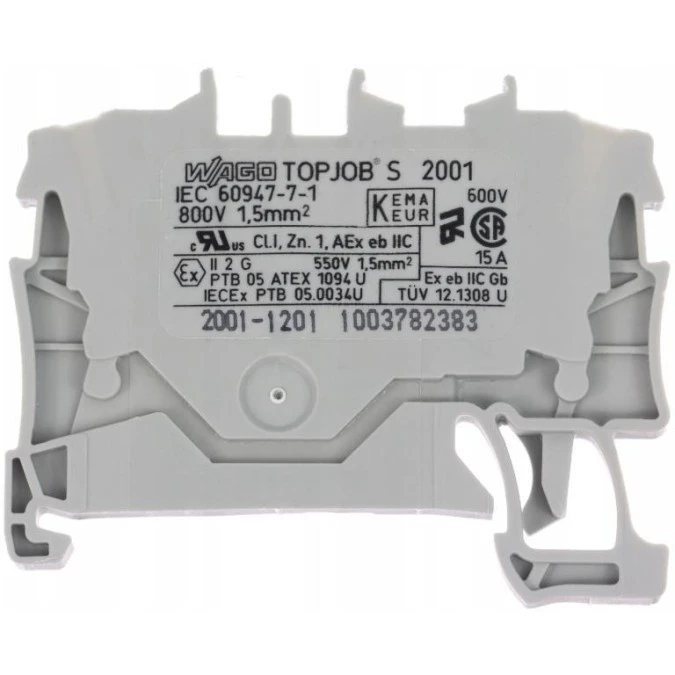 9. WAGO TOPJOBS 2001-1201 Złączka szynowa 2-przewodowa 1,5mm2 na szynę TH35 szara 3.96