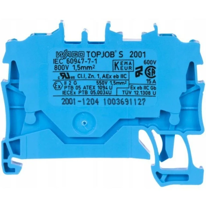 8. WAGO TOPJOBS 2001-1204 Złączka szynowa 2-przewodowa 1,5mm2 na szynę TH35 niebieska 3.96