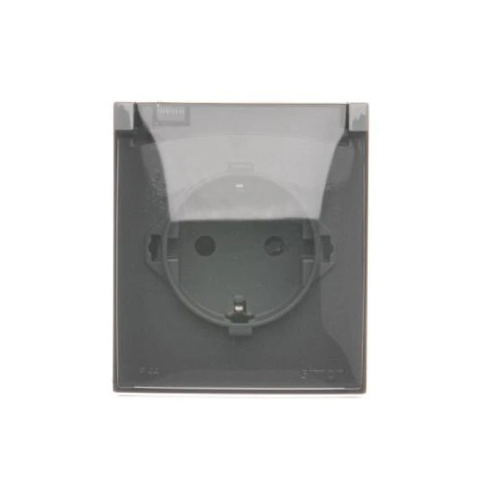 9. Simon Aquaclick Gniazdo natynkowe, Schuko, pojedyncze, klapka transparentna z przesłonami, IP44, zaciski śrubowe ciemnoszary 18.20