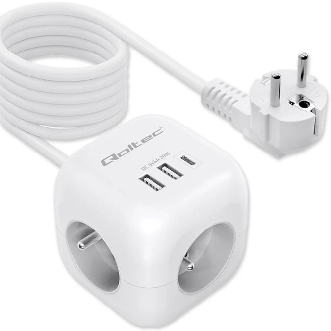 Qoltec Kostka zasilająca przedłużacz 6w1 z podświetlanym włącznikiem 3x AC 2x USB 1x USB-C PD 20W Biała Kabel 2m