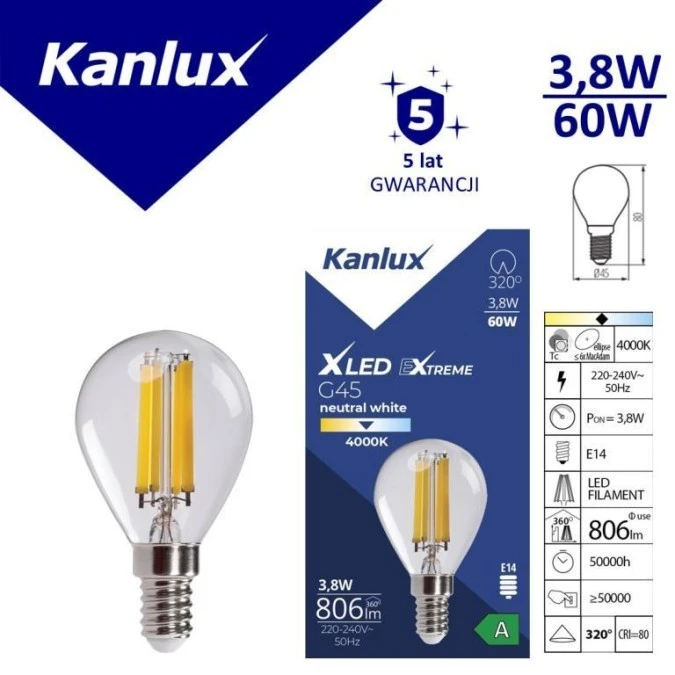 Żarówka LED E14 XLEDEX G45E14 3,8W-NW 806lm 4000K barwa neutralna 5 lat Gwar. 37343