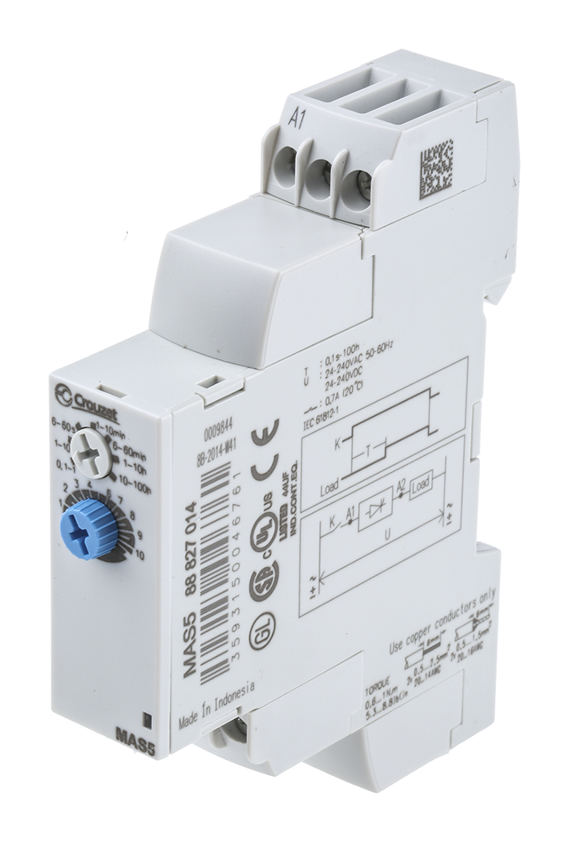 7. Timer Relay Szyna DIN 24 → 240V ac/dc Półprzewodnik 1-stykowy Crouzet SPDT 0.1 s → 100h jednofunkcyjny 334.02