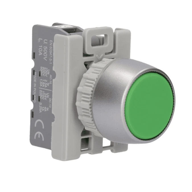 Przycisk sterowniczy z guzikiem krytym 10A z samopowrotem IP65 ZIELONY SP22-KZ-10