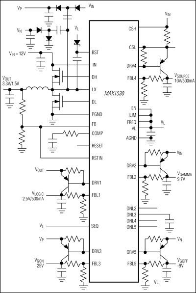 6. Step-Up, Step-Down Regulator, Gate-On Charge Pump, and Boost-Buck Regulator for TV TFT LCD Display Sample