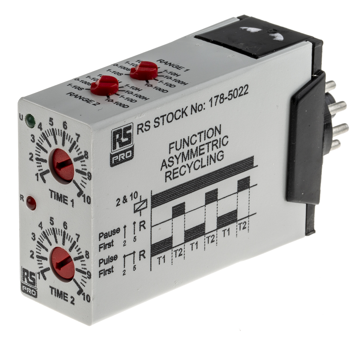 Timer Relay Wciskane 12 → 240V ac/dc DPDT RS PRO DPDT 0.1 s → 100dni Podwójna funkcja funkcyjny