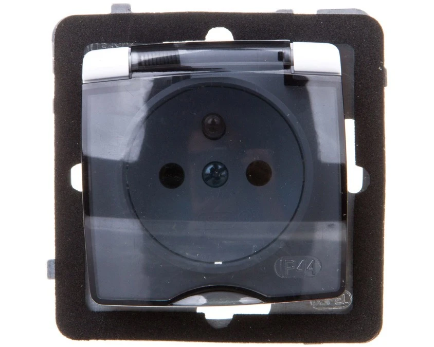 12. KARO Gniazdo pojedyncze z uziemieniem IP44 z przesłonami zaciski gwintowe biały klapka dymna GPH-1SZP/m/00/d OSPEL 23.33