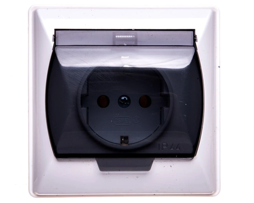 6. AS Gniazdo pojedyncze z uziemieniem schuko IP44 białe wieczko przezroczyste GPH-1GS/m/00/d OSPEL 22.73