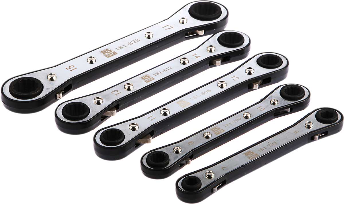 14. Zestaw narzędzi nastawnych Zestaw kluczy zapadkowych RS PRO 7 x 8 → 15 x 17 mm 5 szt. Stal chromowo-wanadowa 347.82